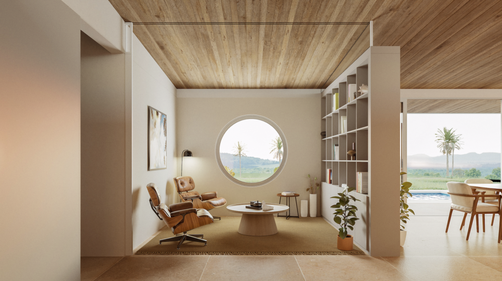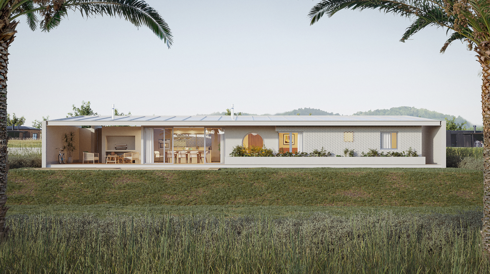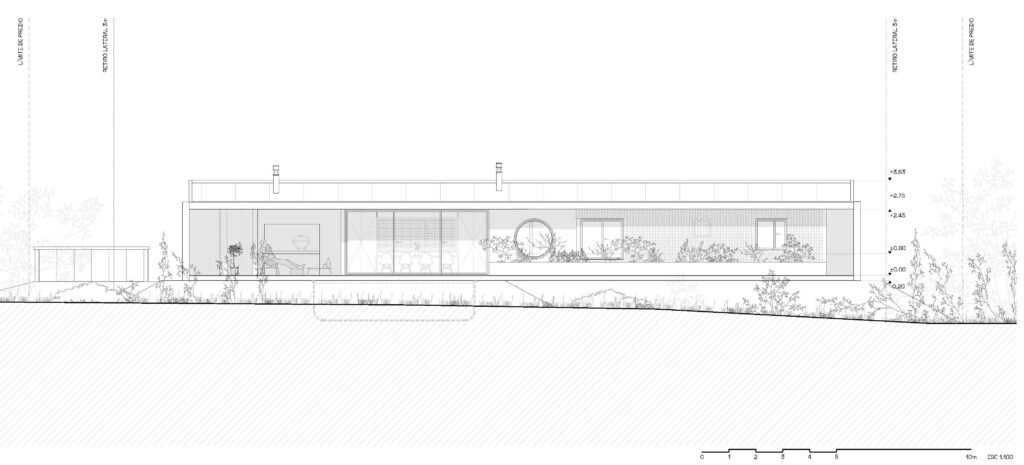 Ubicada en una chacra de Maldonado, esta vivienda se agazapa en un solo nivel para integrarse armónicamente a la escala rural. El diseño prioriza la privacidad mediante un perímetro de muros ciegos y calados que contienen espacios de servicio y transición. Su distribución lineal se orienta hacia el horizonte y las palmeras del entorno, capturando el atardecer. Con un área social integrada como corazón del hogar, la arquitectura logra un refugio hermético hacia el barrio y abierto al paisaje.